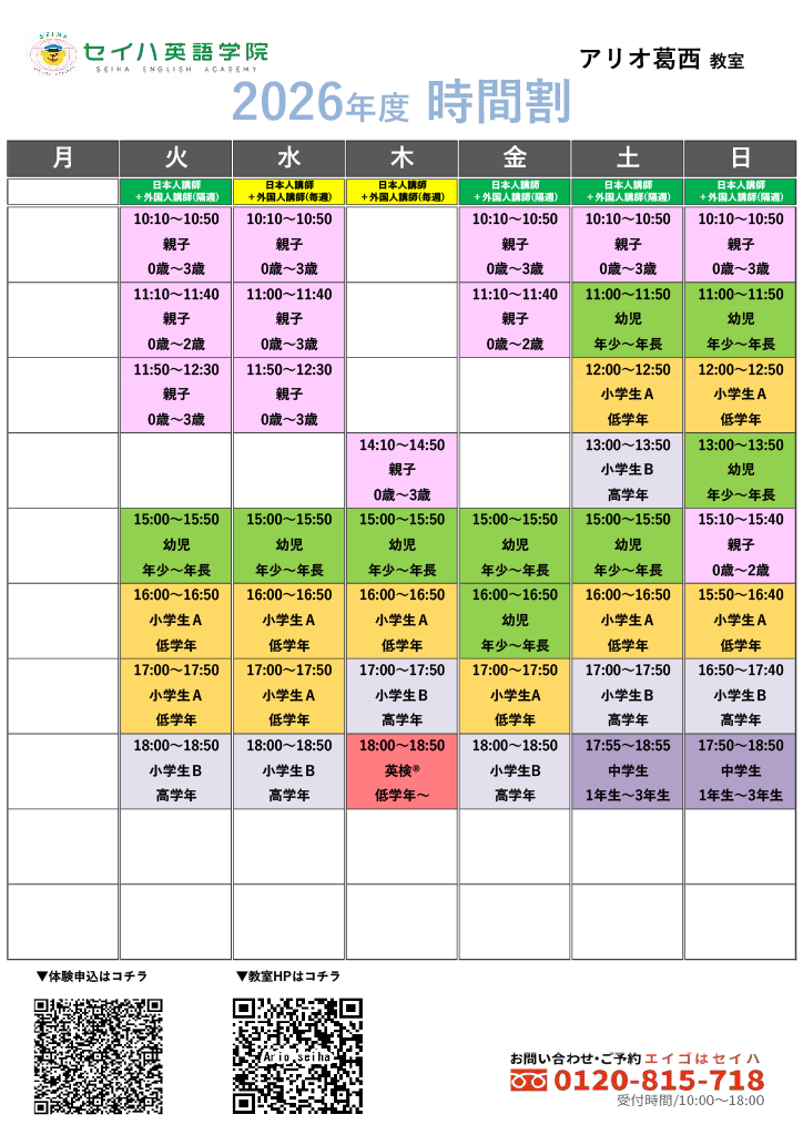 ※ 予告なく受付時間を変更する場合やスクールホリデー等があります。ご来校前にお電話にてご確認ください。