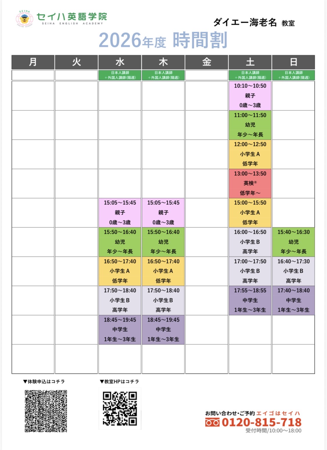 ※ 予告なく受付時間を変更する場合やスクールホリデー等があります。ご来校前にお電話にてご確認ください。
