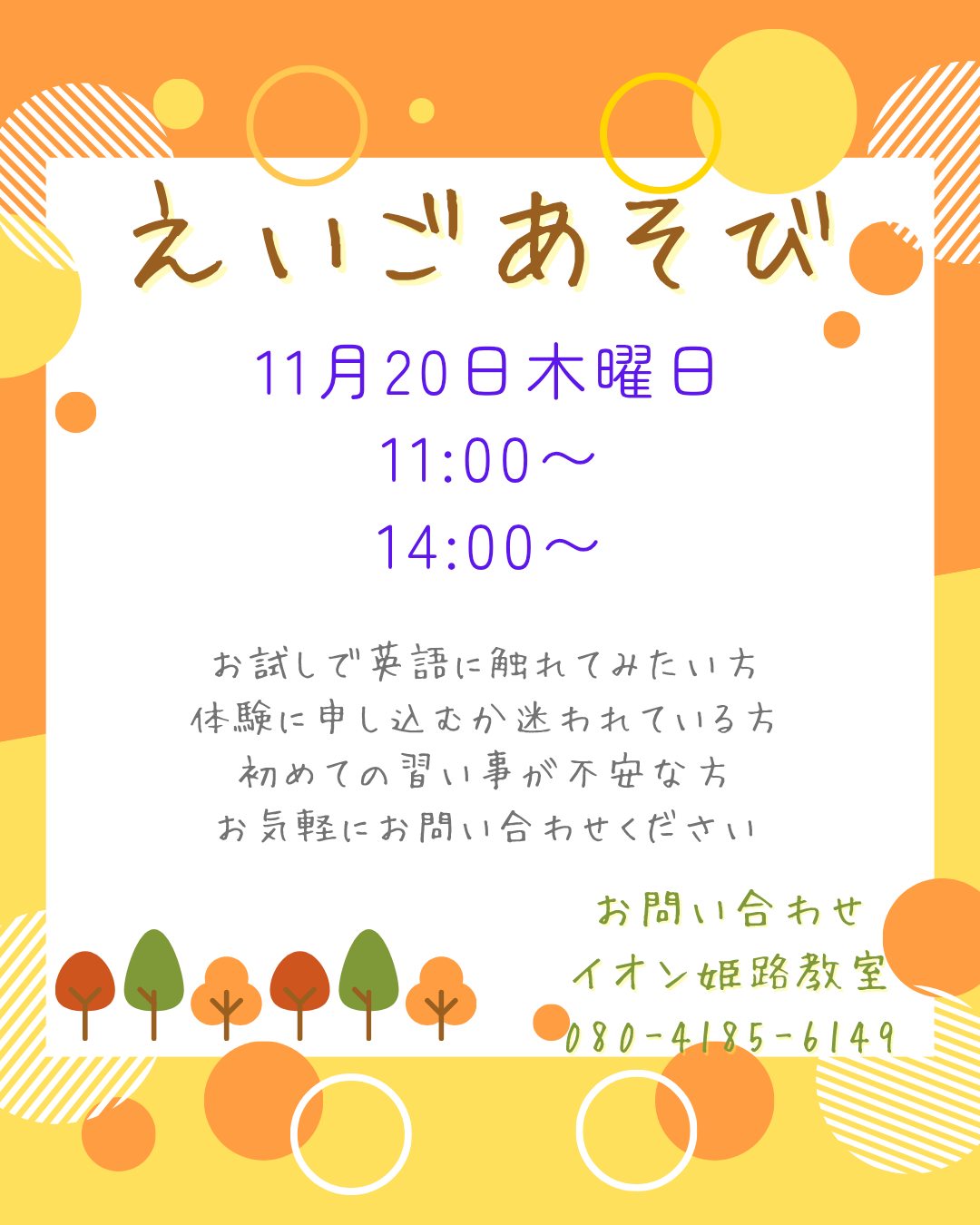 ※ 予告なく受付時間を変更する場合やスクールホリデー等があります。ご来校前にお電話にてご確認ください。