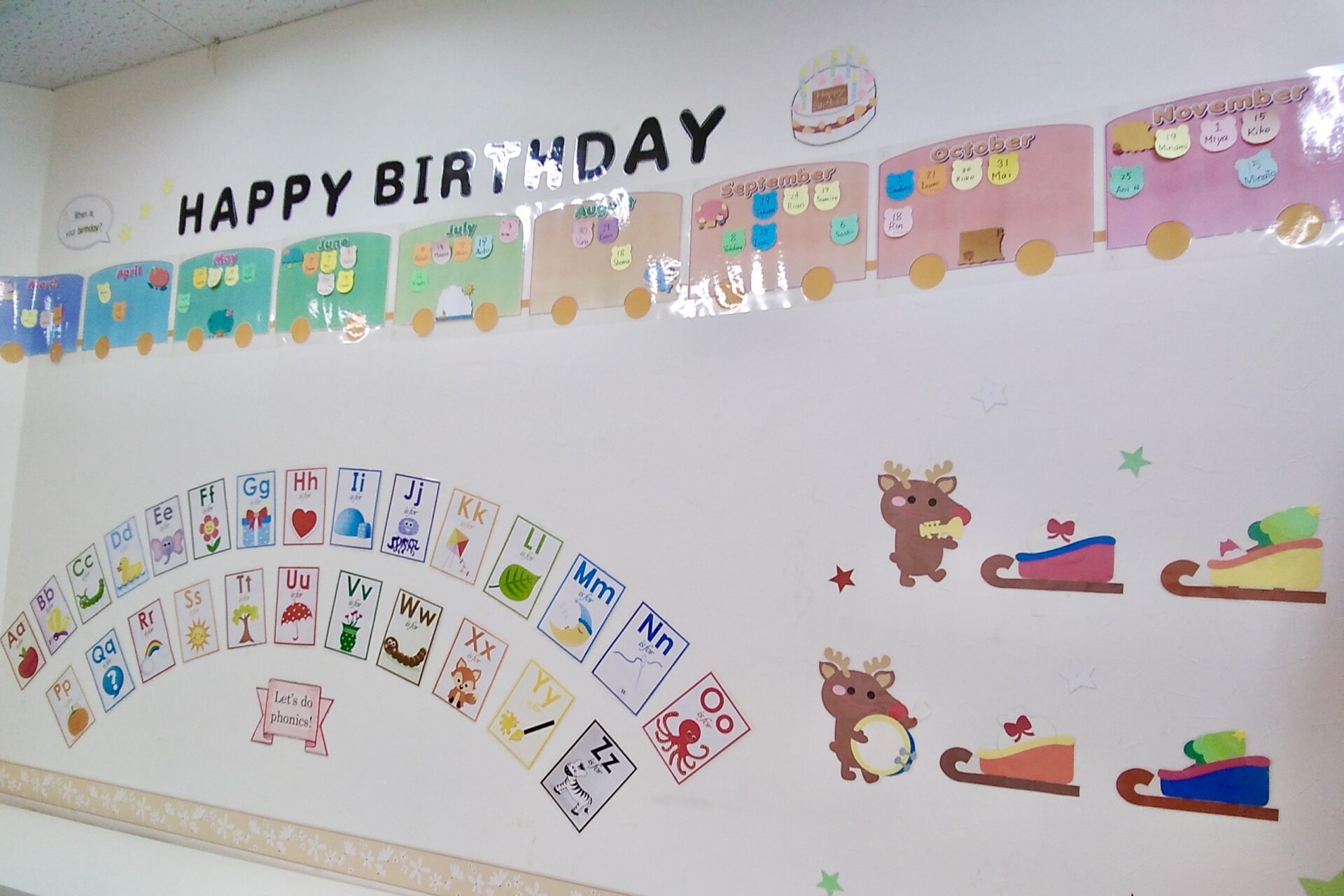 音楽やリズム、ゲームを通し、楽しく体を動かして英語を覚えます。言語の区別がないこの時期だからこそ、たくさん聞いて音の違いを聞き分ける力をつけます。