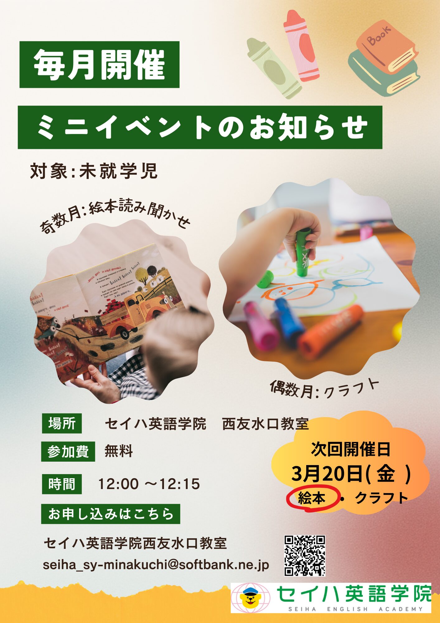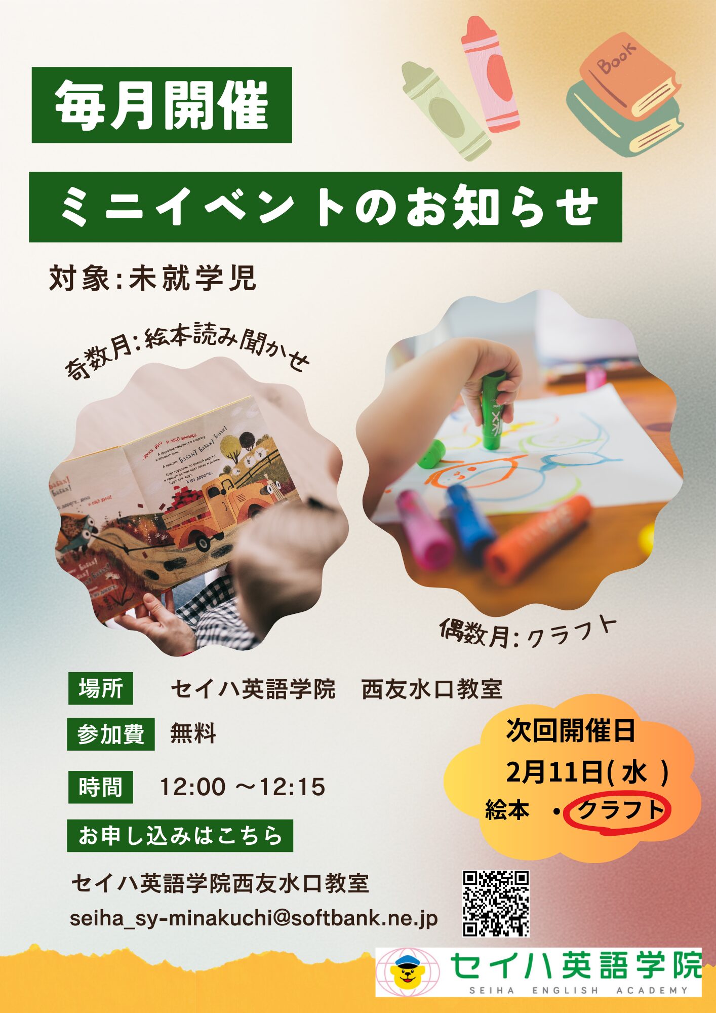 ※ 予告なく受付時間を変更する場合やスクールホリデー等があります。ご来校前にお電話にてご確認ください。