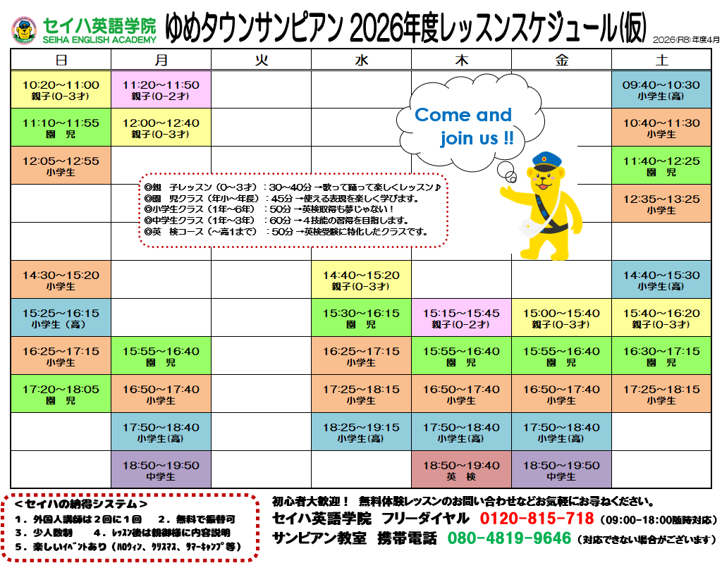 ※ 予告なく受付時間を変更する場合やスクールホリデー等があります。ご来校前にお電話にてご確認ください。