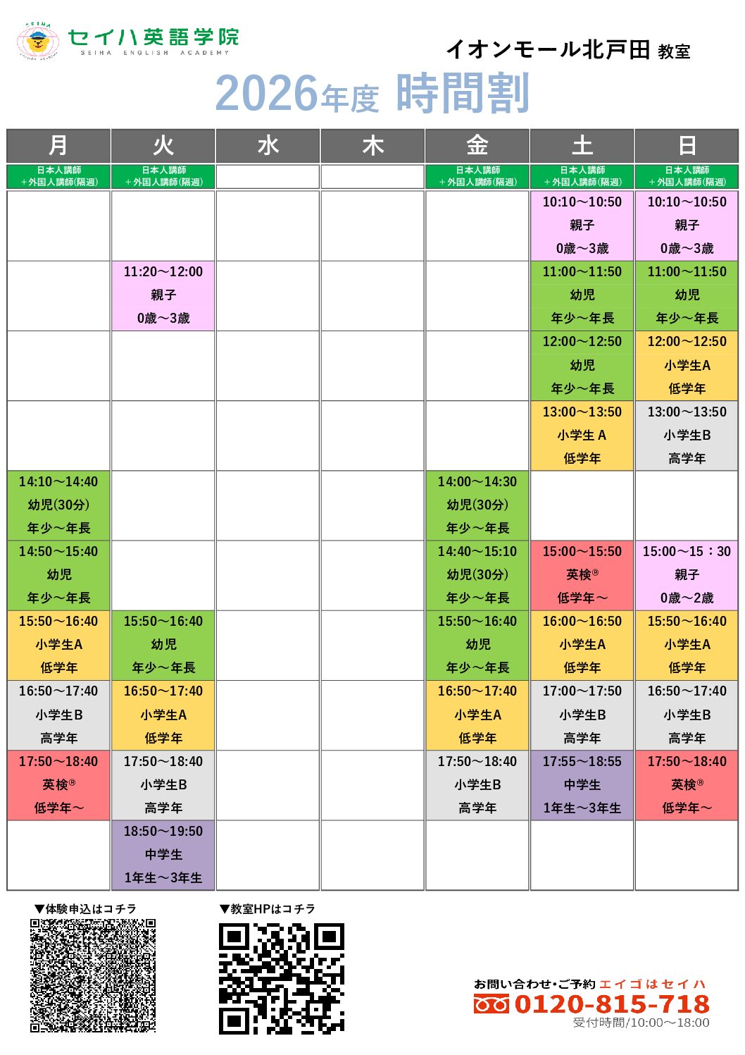 ※ 予告なく受付時間を変更する場合やスクールホリデー等があります。ご来校前にお電話にてご確認ください。