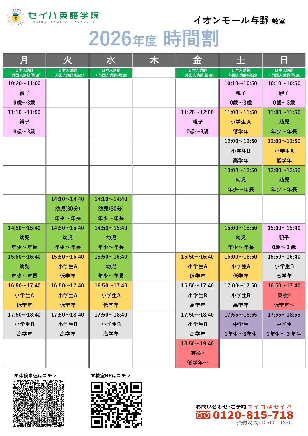 ※ 予告なく受付時間を変更する場合やスクールホリデー等があります。ご来校前にお電話にてご確認ください。