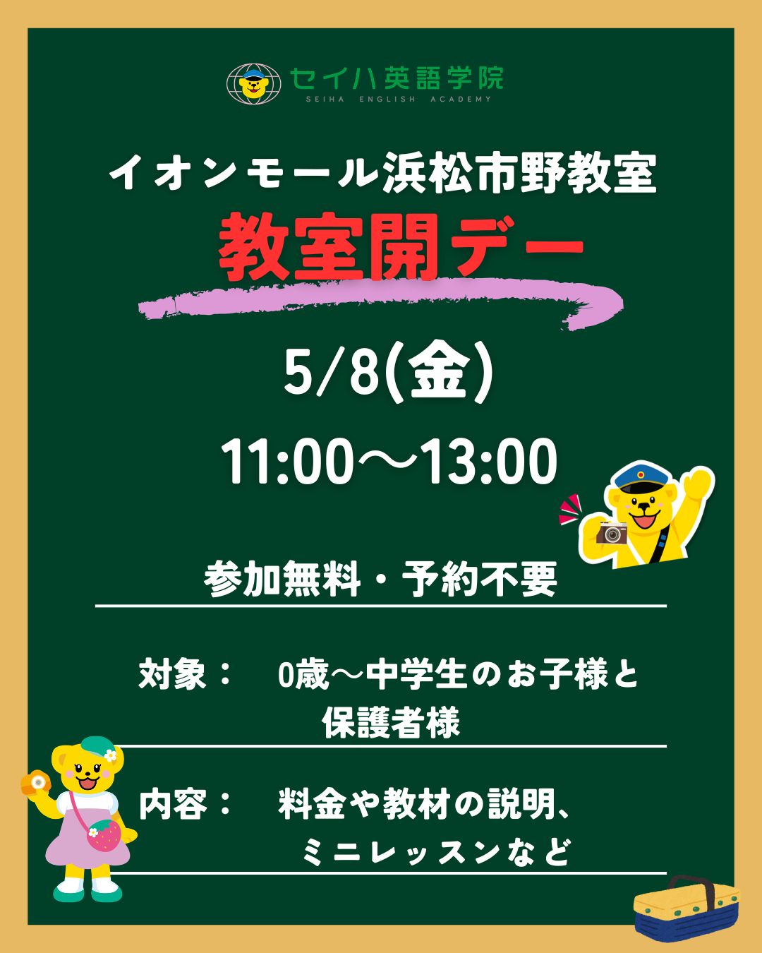※ 予告なく受付時間を変更する場合やスクールホリデー等があります。ご来校前にお電話にてご確認ください。