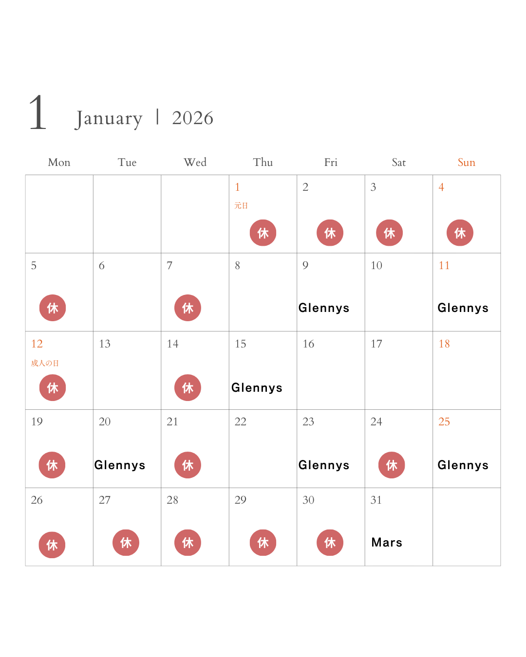 | 月曜日 | 火曜日 | 水曜日 | 木曜日 | 金曜日 | 土曜日 | 日曜日 |