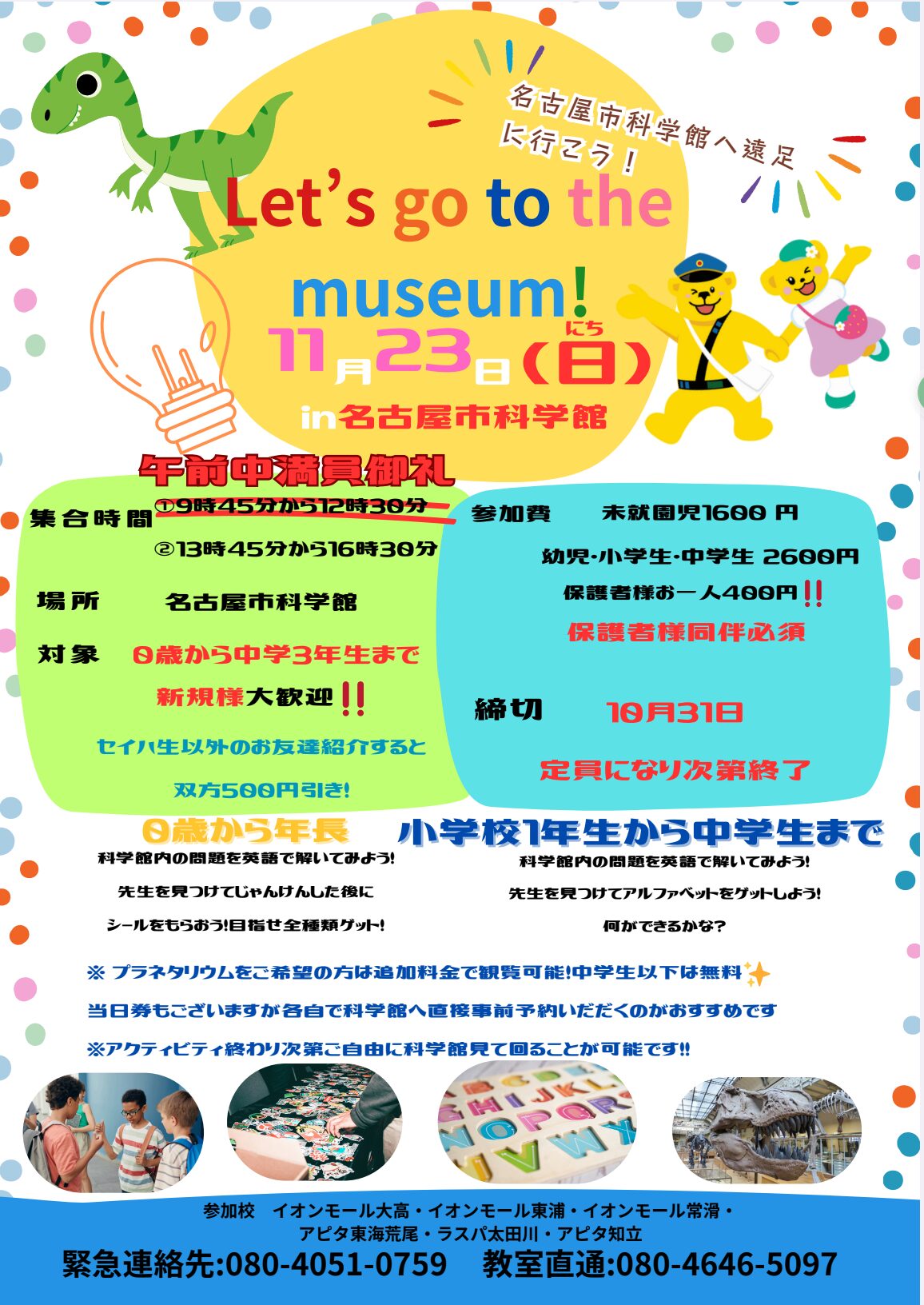 ※ 予告なく受付時間を変更する場合やスクールホリデー等があります。ご来校前にお電話にてご確認ください。