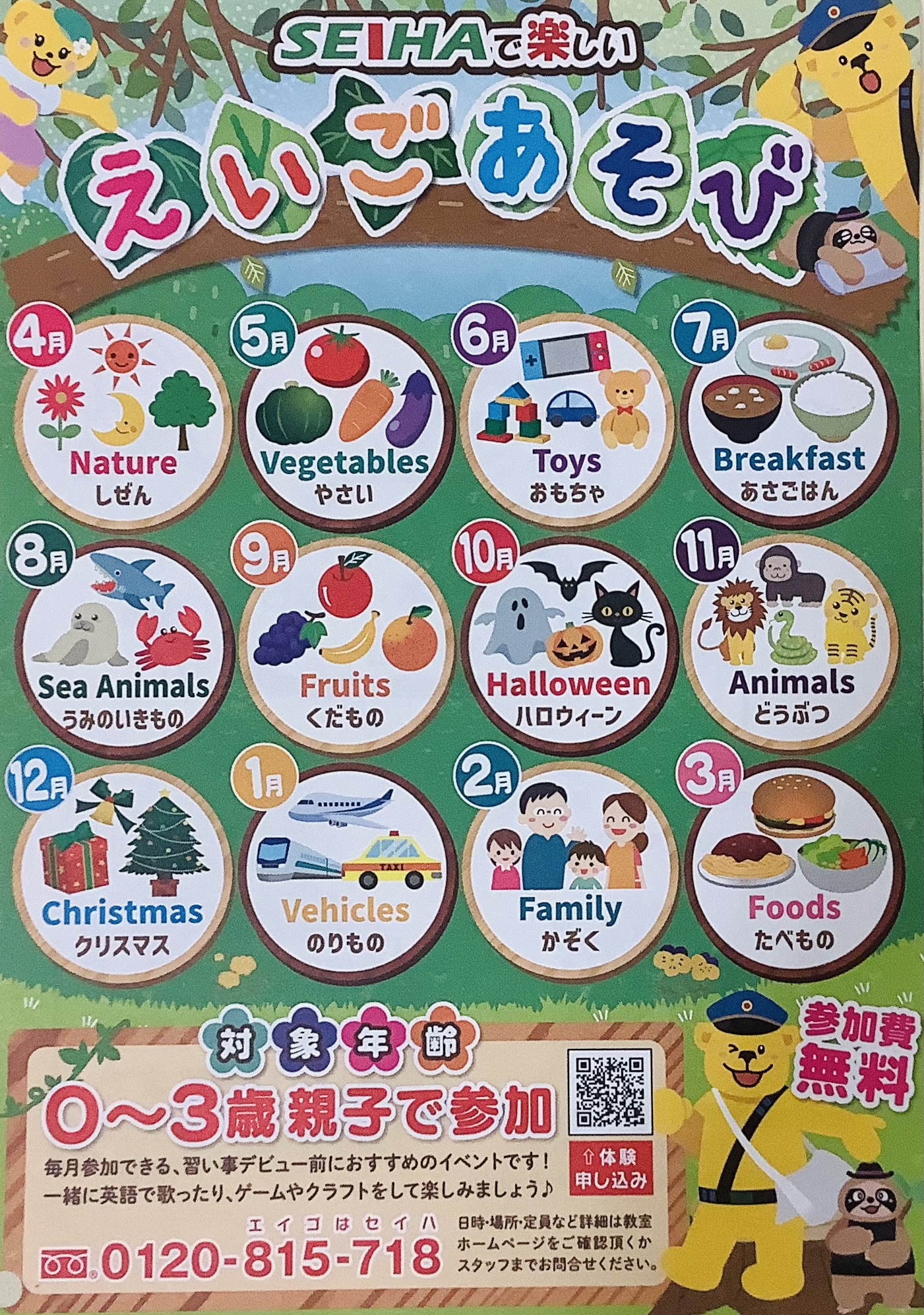 音楽やリズム、ゲームを通し、楽しく体を動かして英語を覚えます。言語の区別がないこの時期だからこそ、たくさん聞いて音の違いを聞き分ける力をつけます。