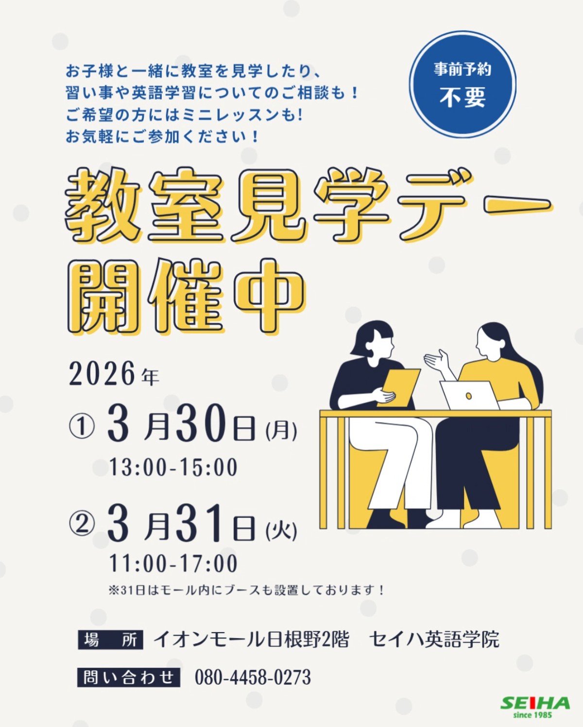 ※ 予告なく受付時間を変更する場合やスクールホリデー等があります。ご来校前にお電話にてご確認ください。
