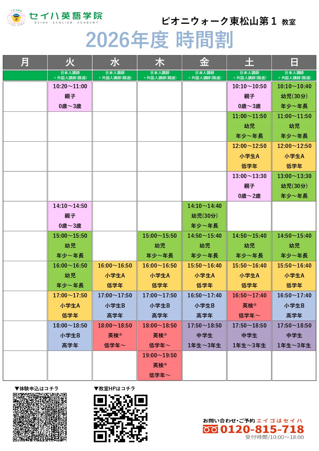 ※ 予告なく受付時間を変更する場合やスクールホリデー等があります。ご来校前にお電話にてご確認ください。