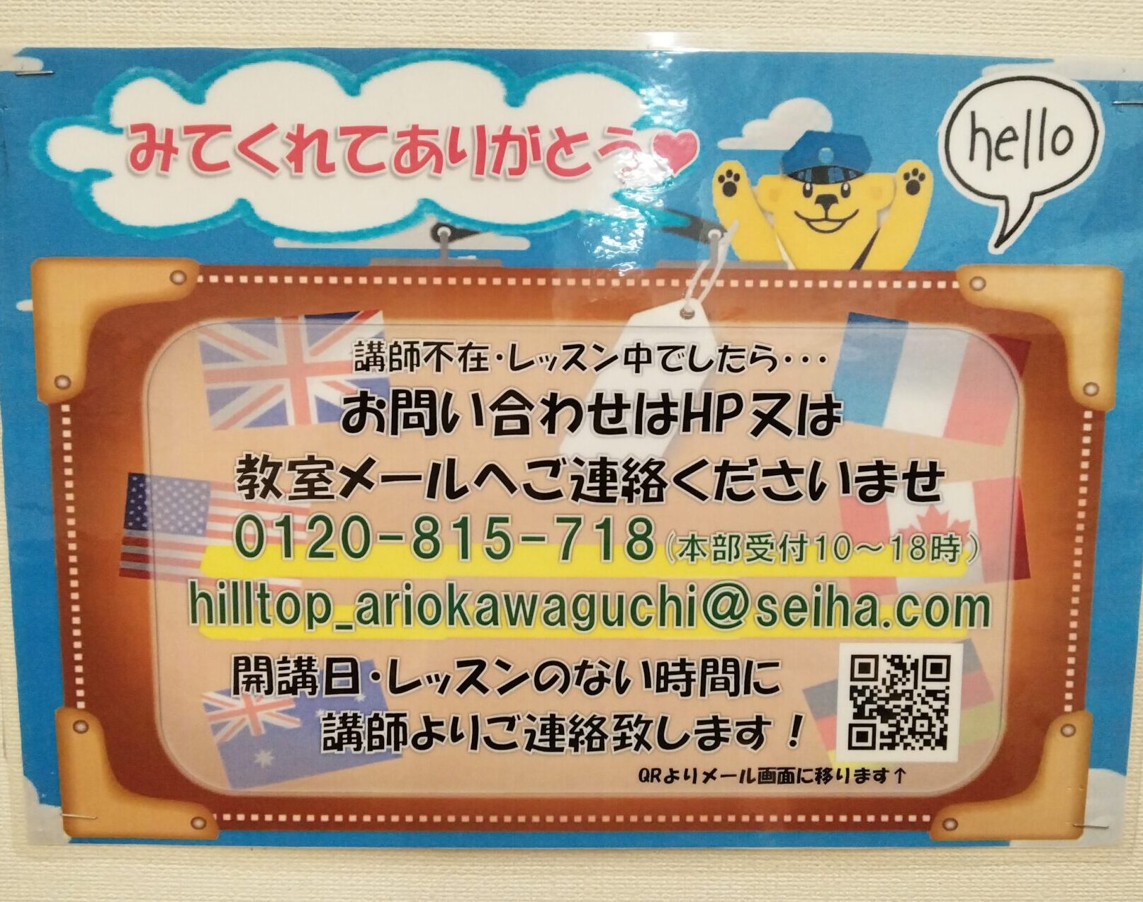 ※ 予告なく受付時間を変更する場合やスクールホリデー等があります。ご来校前にお電話にてご確認ください。