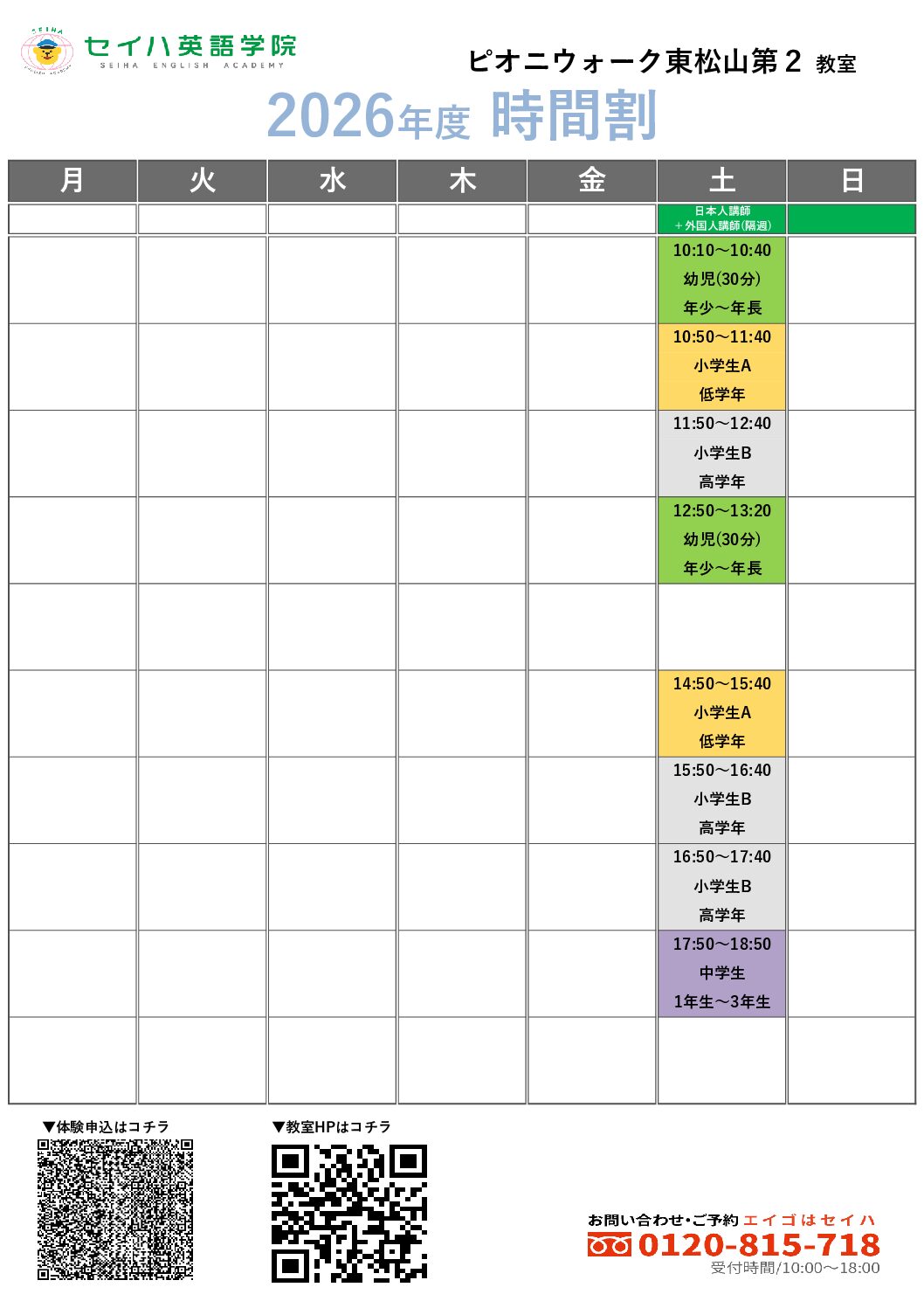 ※ 予告なく受付時間を変更する場合やスクールホリデー等があります。ご来校前にお電話にてご確認ください。
