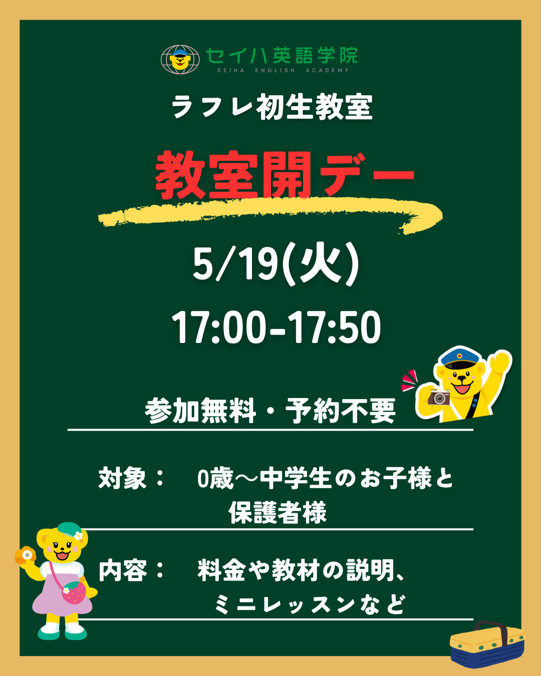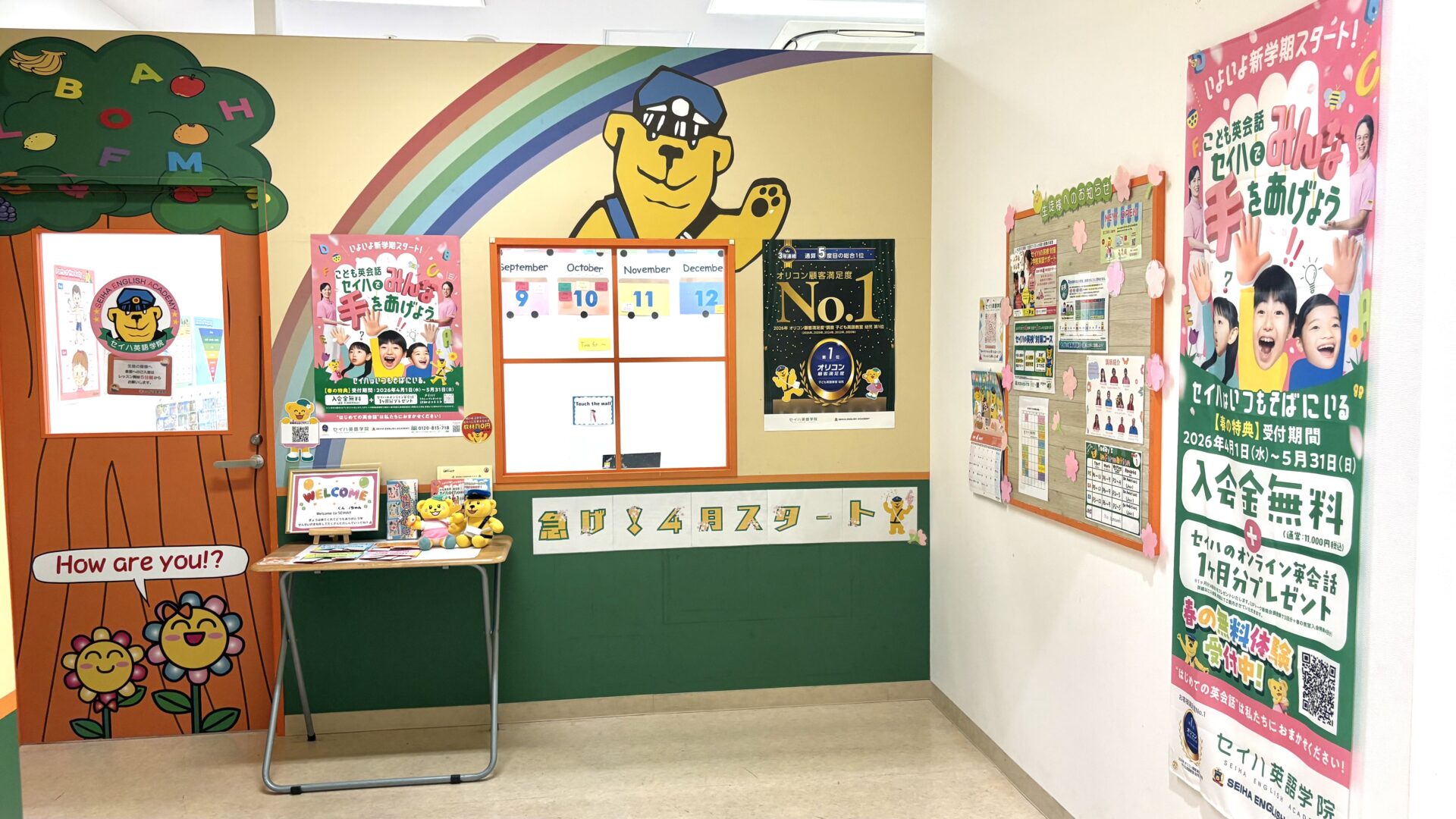※ 予告なく受付時間を変更する場合やスクールホリデー等があります。ご来校前にお電話にてご確認ください。