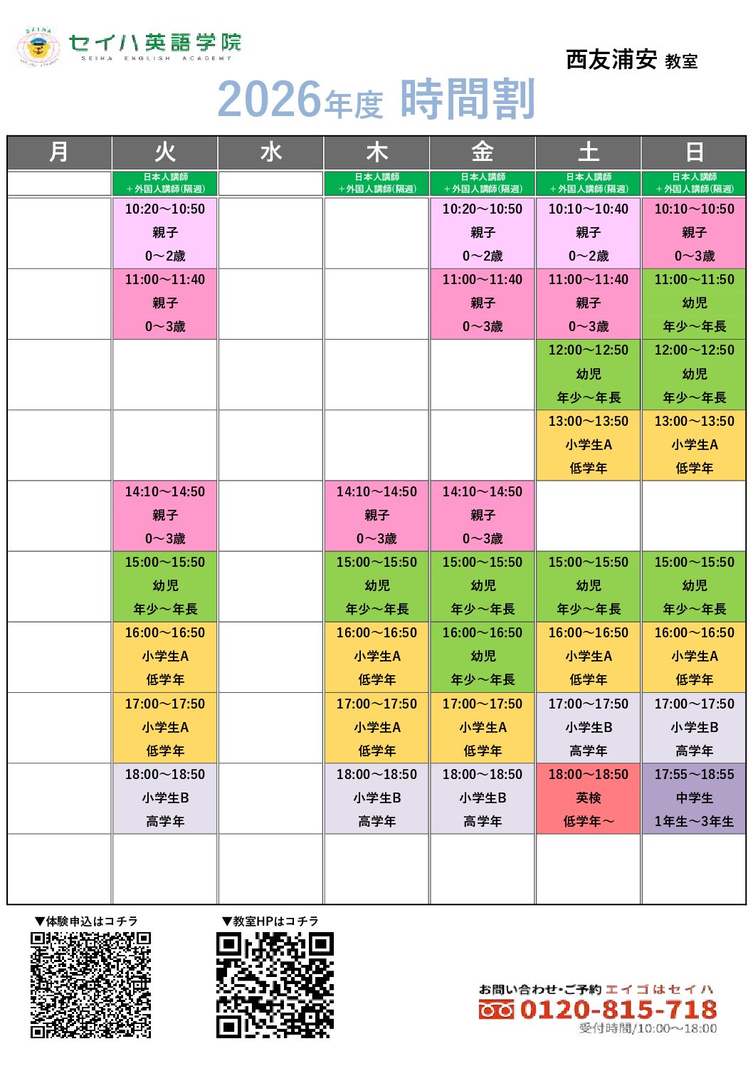 ※ 予告なく受付時間を変更する場合やスクールホリデー等があります。ご来校前にお電話にてご確認ください。
