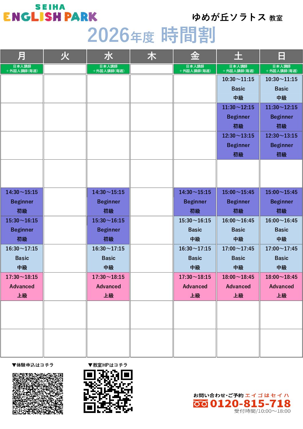 ※ 予告なく受付時間を変更する場合やスクールホリデー等があります。ご来校前にお電話にてご確認ください。
