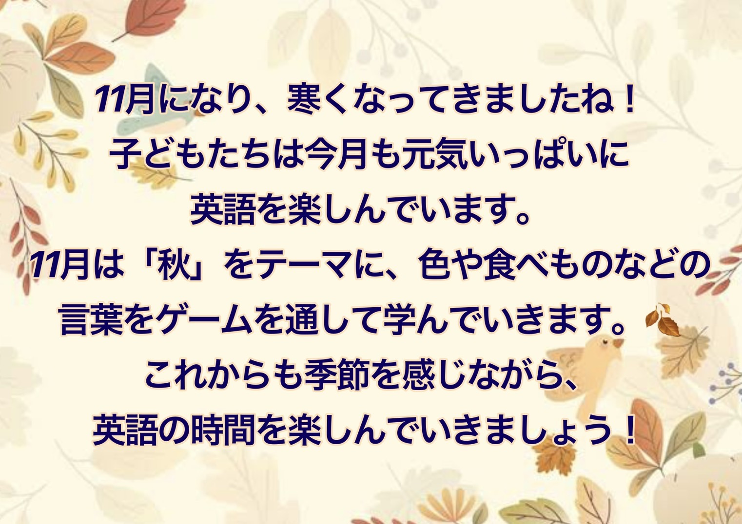 こんにちは!11月の教室だよりです♪三河の教室では、レッスン内容やおすすめの歌などを毎月Googleマップに掲載しています。ぜひお近くの教室を検索して覗いてみてください☺︎窓のある教室が多いので、お買い物の際もぜひ楽しい子どもたちとレッスンの様子を覗いてみてください♪さて、11月よりサンタスクールがスタートしました☆様々な特典もございます。ぜひお気軽にお問合せください☺︎