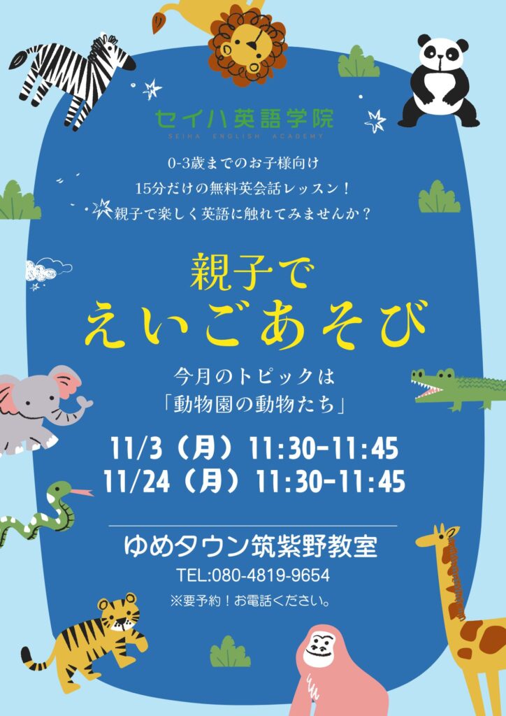 セイハ英語学院では、0〜3歳のお子様と保護者の方を対象に、無料の英会話ミニレッスンを開催します!今月のテーマは「動物園の動物たち」🦁