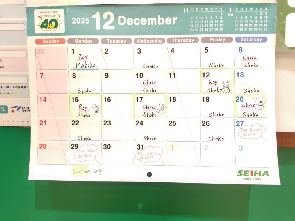 黄色の枠はクリスマスパーティです!クリスマスパーティ日にお休みされる場合は、同じクリスマスの枠へはご自身でお振替いただけます。通常レッスンにお振替されたい場合は講師にお声かけください。
