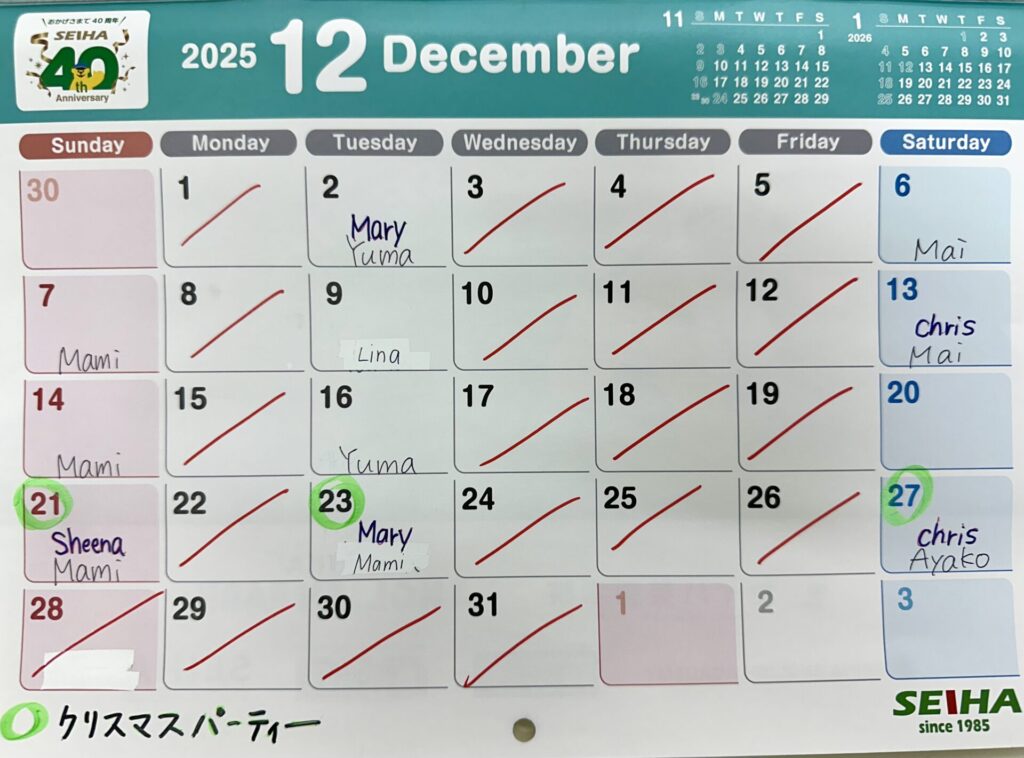 ○の日程はクリスマスパーティーを実施致しますので、体験をお受けいたしかねます。ご理解をお願い申し上げます。