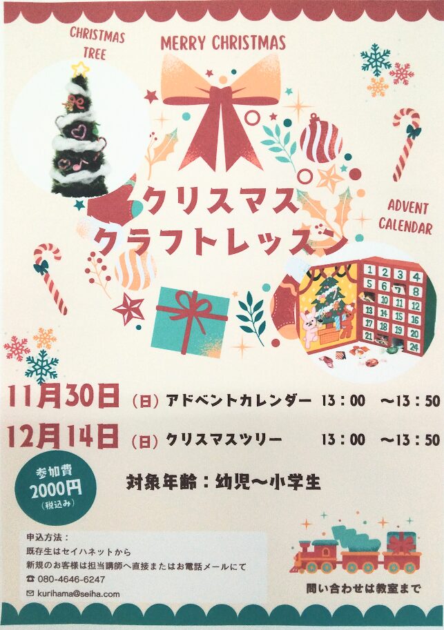 イオン久里浜教室では、クリスマスクラフトレッスンを開催します。