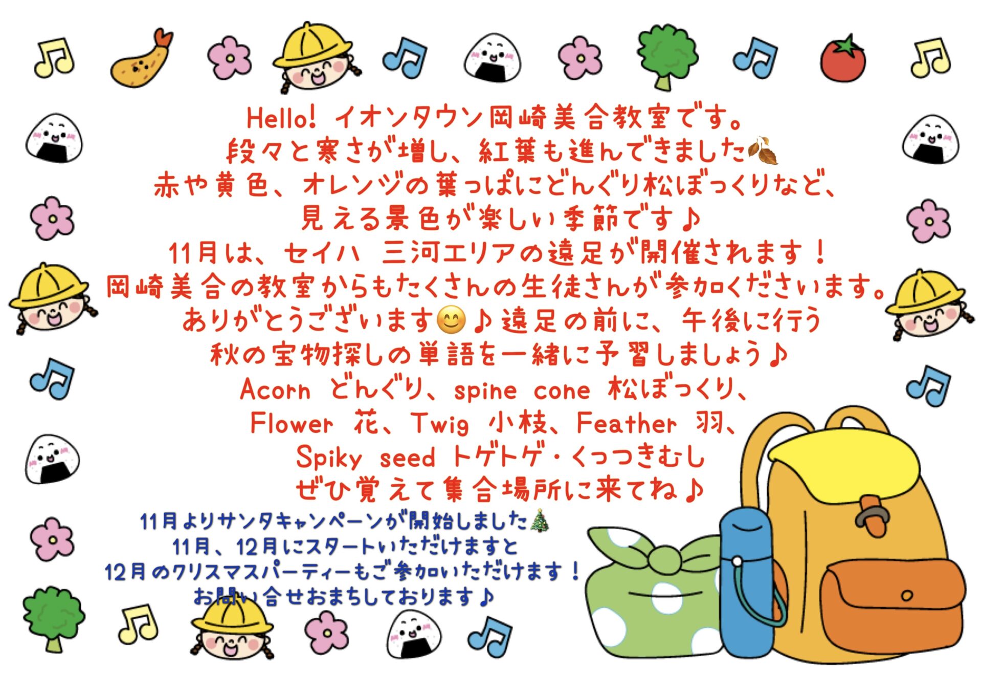 こんにちは!11月の教室だよりです♪三河の教室では、レッスン内容やおすすめの歌などを毎月Googleマップに掲載しています。ぜひお近くの教室を検索して覗いてみてください☺︎窓のある教室が多いので、お買い物の際もぜひ楽しい子どもたちとレッスンの様子を覗いてみてください♪