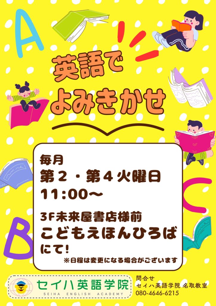 Hello✨イオンモール名取教室です♪英語でよみきかせのお知らせです🌈お買い物ついでにお気軽にお立ち寄りください👌✼••┈┈┈┈┈••✼予定日時✼••┈┈┈┈┈••✼日程:11月25日(火)場所:3F未来屋書店様前 こどもえほんひろば実施時間:11:00~ご予約はお電話(SMS)やメールなどお気軽にお問い合わせください。画像をクリックまたはタップするとメールを送信できます。お電話はこちらをクリックまたはタップ☎