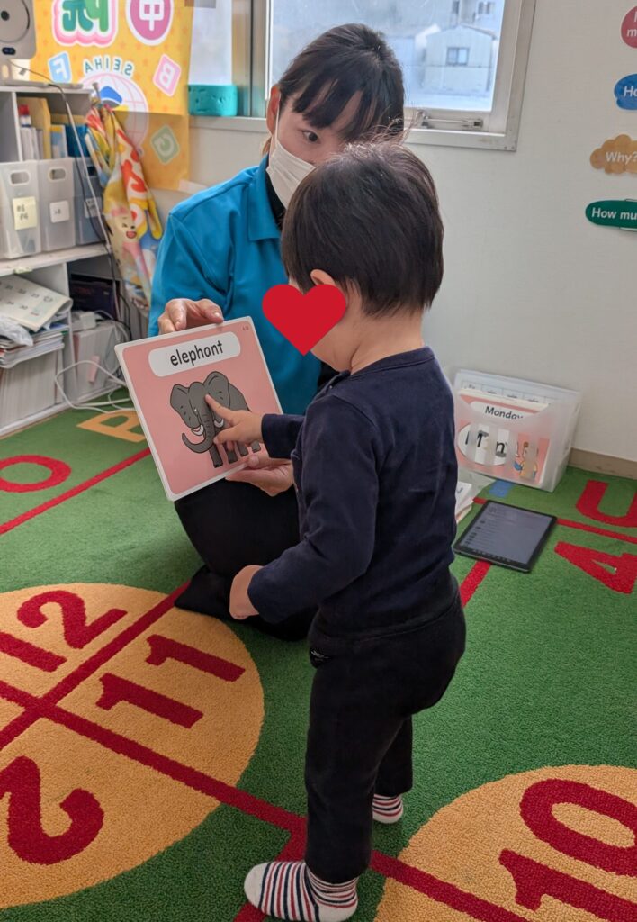 動物たちのフラッシュカードにも興味津々で、講師の英語をまねっこ!
