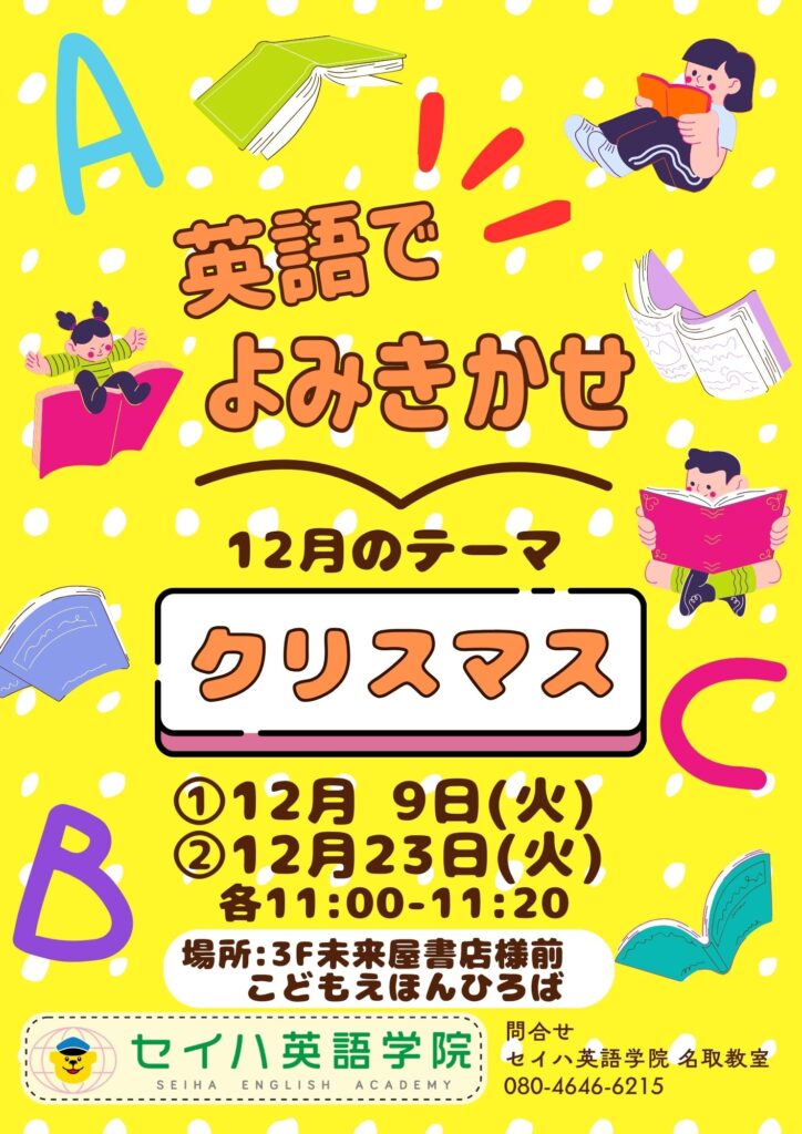 Hello✨イオンモール名取教室です♪英語でよみきかせのお知らせです🌈お買い物ついでにお気軽にお立ち寄りください👌✼••┈┈┈┈┈••✼予定日時✼••┈┈┈┈┈••✼日程:12月9日,23日(火)場所:3F未来屋書店様前 こどもえほんひろば実施時間:11:00~ご予約はお電話(SMS)やメールなどお気軽にお問い合わせください。画像をクリックまたはタップするとメールを送信できます。お電話はこちらをクリックまたはタップ☎