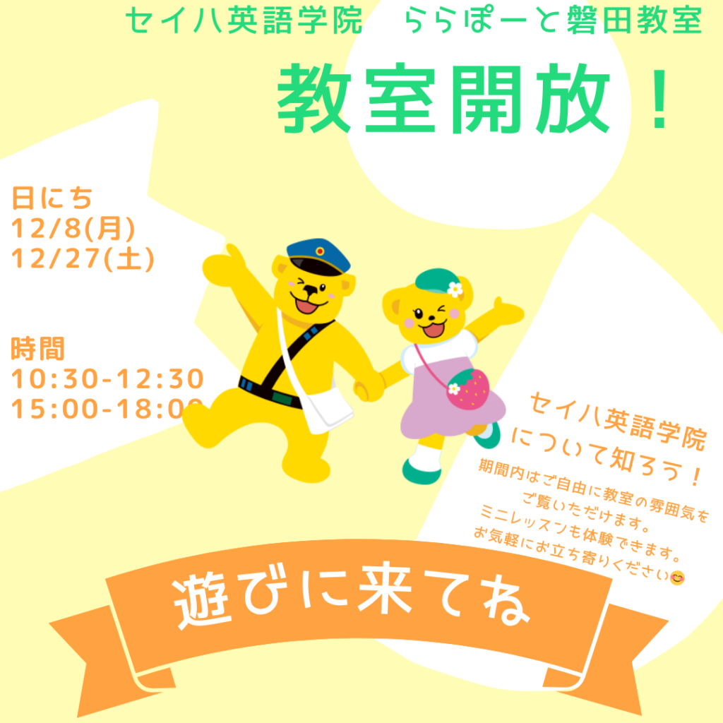 以下の期間中、教室を開放いたします!!12/8(月) ・12/27(土)10:30~12:30、15:00~18:00料金や教材についてなど、どんなご質問でもお答えします!15分ほどのミニレッスンで雰囲気を感じてみることも可能です♪