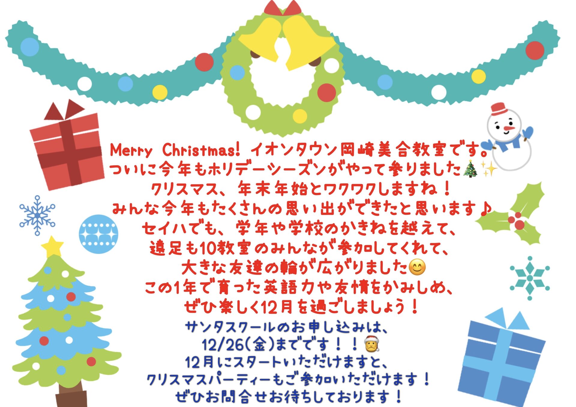 さて、サンタスクールは12月26日(金)までの受付です!2回の体験レッスンが受けられる絶好の機会です!ぜひお気軽にお問合せください☺︎