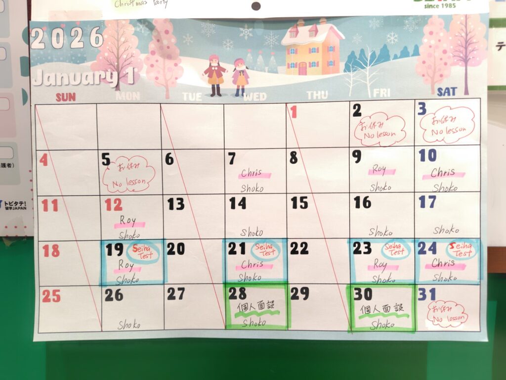 ブルーの枠はセイハテスト(年少~中学生)です!冬休みを使い、たくさん復習をしてくださいね!