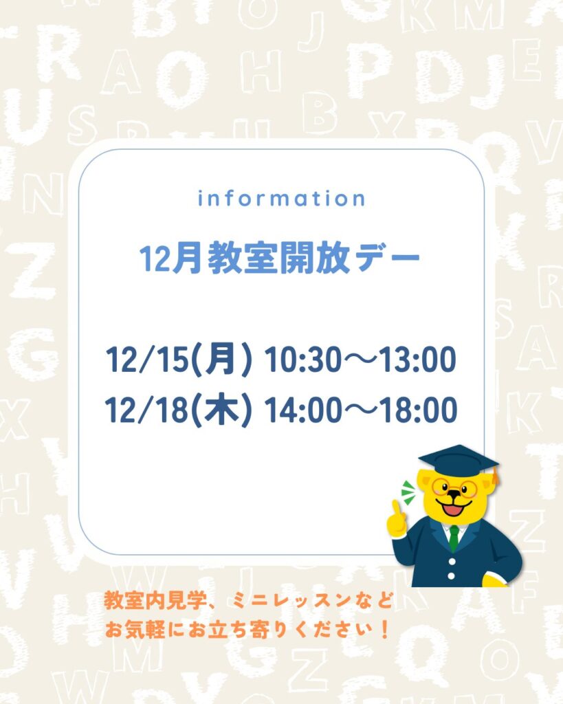 もちろん既存生の皆様もお子様の様子や質問など受け付けておりますのでこの機会に是非お越しください!