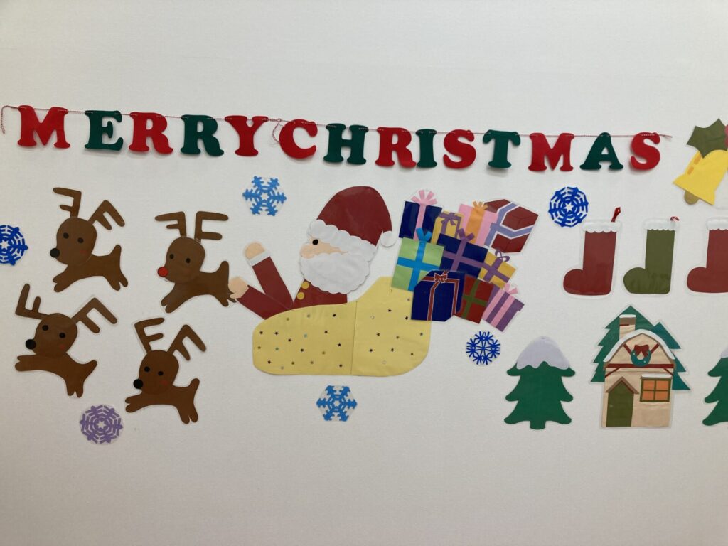 教室いっぱいにクリスマスの飾りつけをし、先生たちもサンタの姿でお出迎えします🎅✨