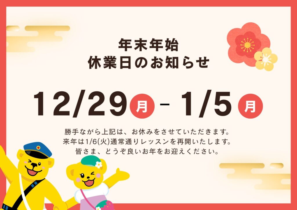 12月29日から1月5日までお休みとなります。1月6日(火)より通常通りレッスンを行います。