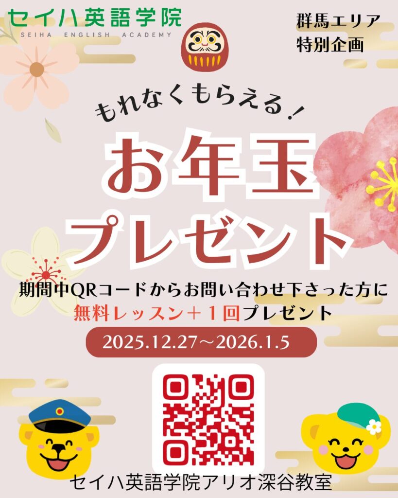 群馬エリアでは、年末年始にお問い合わせ下さった方に、お年玉プレゼントとして、通常体験レッスンに加えさらにもう一回無料レッスンをプレゼントいたします☆☆(実質2回無料体験レッスン!!)
