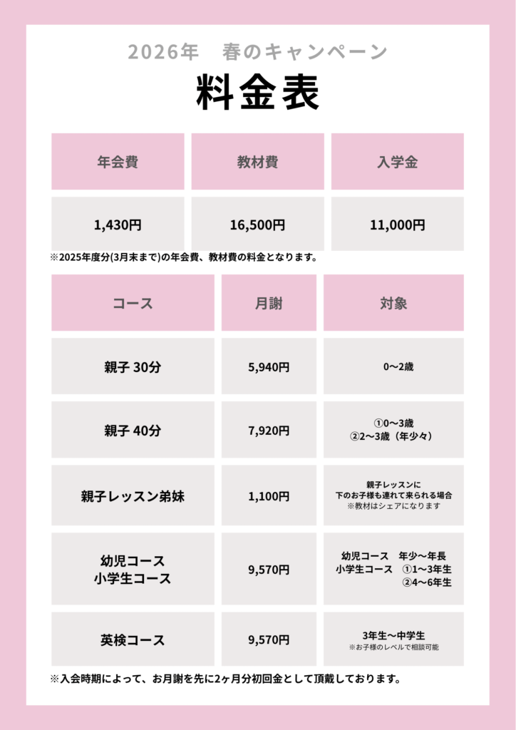 1/5(月)〜3/31(火)の春の入会キャンペーンの料金表です!