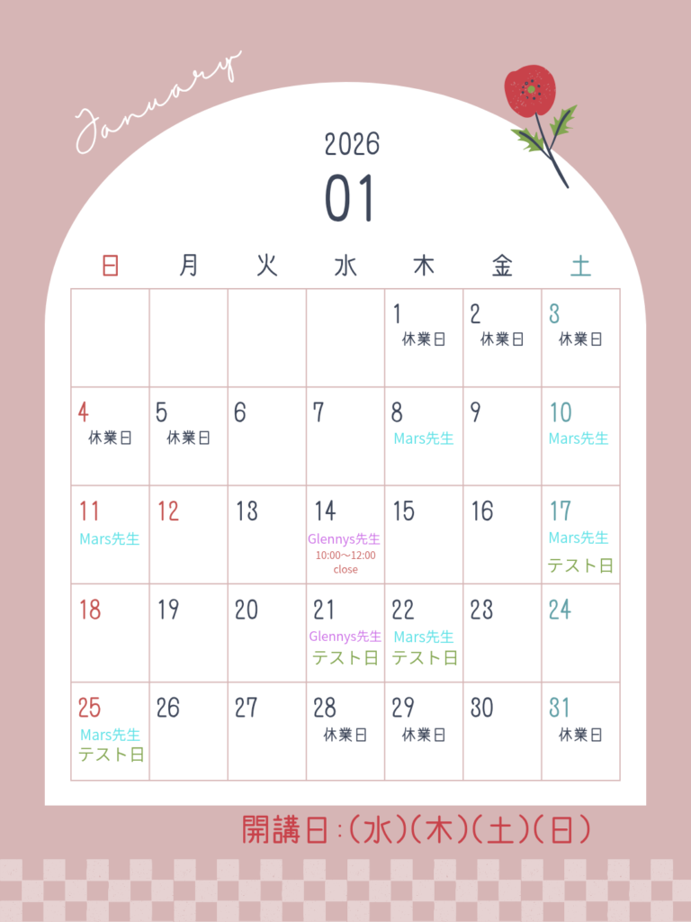 ※テスト日(既存生のテスト日となります。通常のレッスン内容とは異なるため、別日をご検討頂く場合があります。事前のご相談ください。)