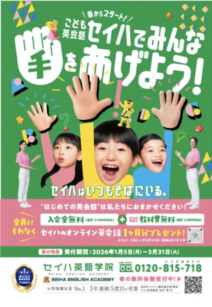1月5日(月)~3月31日(火)期間にご入会申込みのお客様①入会金無料!(通常:11,000円)②1月~3月スタート生は2025年度分の教材費が無料!(通常:5,500円)③全員にもれなくセイハのオンライン英会話1ヶ月分プレゼント!