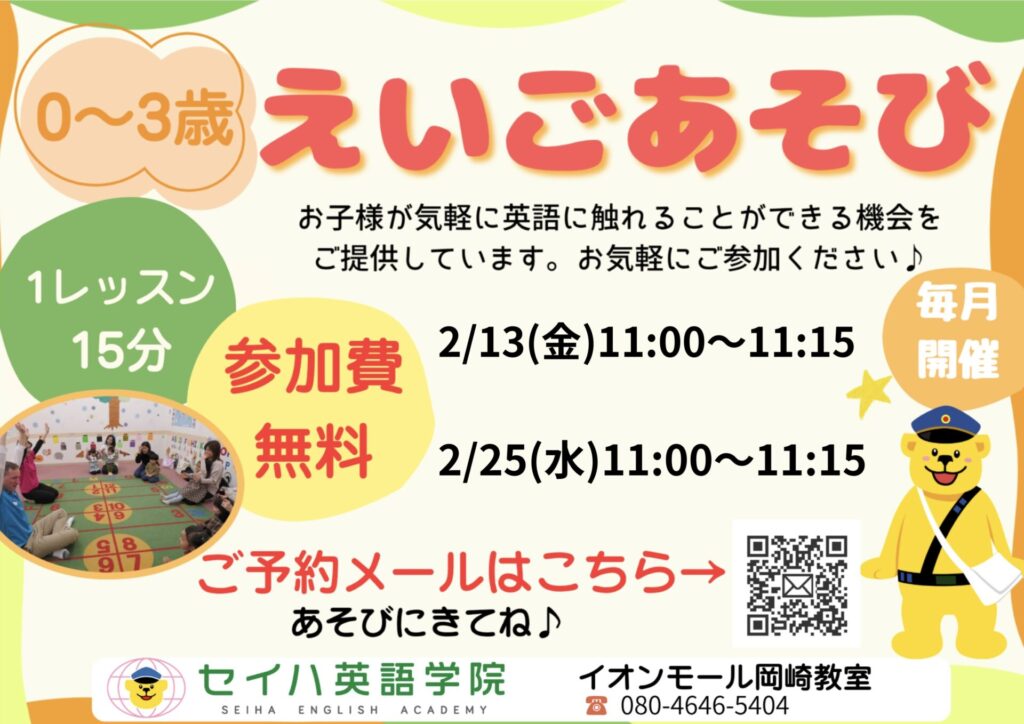 次回英語あそびのご案内です!英語あそびは、教室やショッピングセンターの広場で開催するため、天気や気温を気にせず、室内でご参加いただけます♪ぜひ歌やゲームを織り交ぜながら 、「冬の洋服」に関する単語や数字、アルファベットに触れて楽しみませんか?15分のみなのでお気軽にご参加いただけ、外国人講師ともふれあえます☆お散歩やお買い物ついでに、ぜひお立ち寄りください♪講師一同お待ちしております(^^)