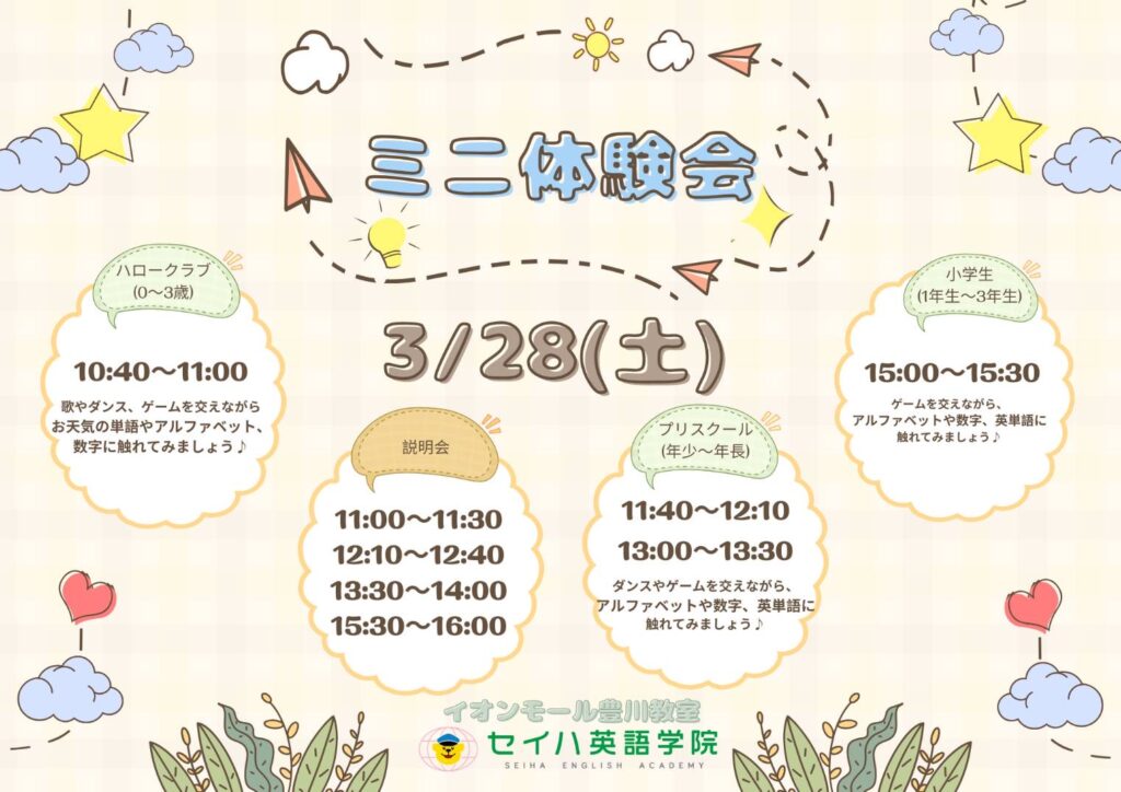 【ミニ体験会のお知らせ】3月28日(土) イオンモール豊川教室にて、ミニ体験会を実施いたします!