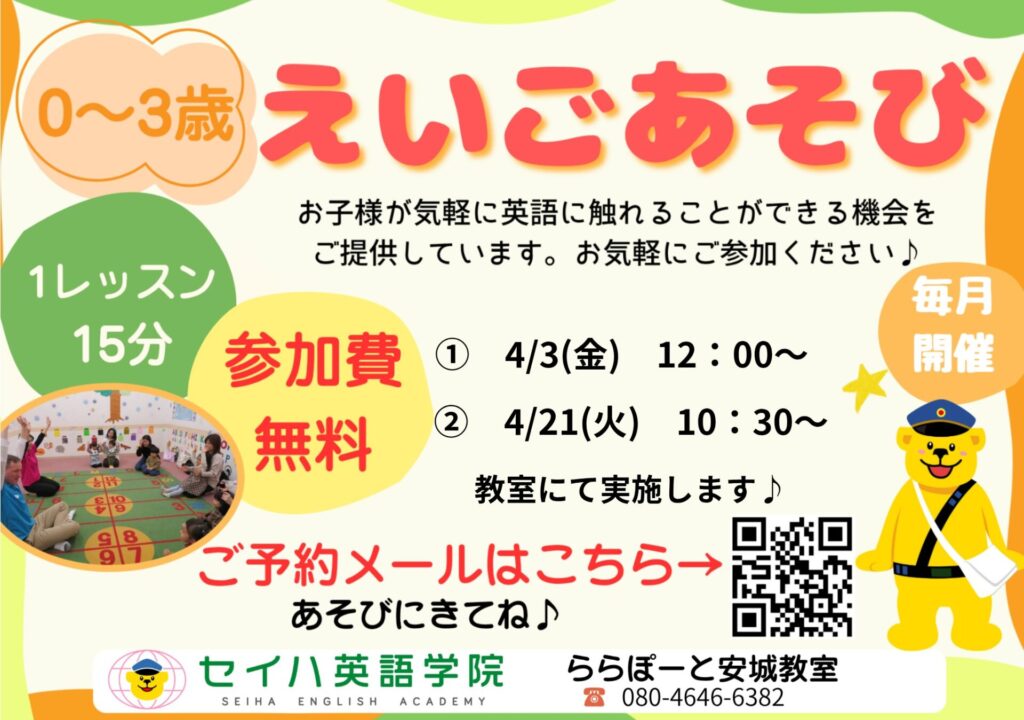 次回英語あそびのご案内です!英語あそびは、教室やショッピングセンターの広場で開催するため、天気や気温を気にせず、室内でご参加いただけます♪ぜひ歌やゲームを織り交ぜながら 、「遊び場」に関する単語や数字、アルファベットに触れて楽しみませんか?15分のみなのでお気軽にご参加いただけ、外国人講師ともふれあえます☆お散歩やお買い物ついでに、ぜひお立ち寄りください♪講師一同お待ちしております(^^)
