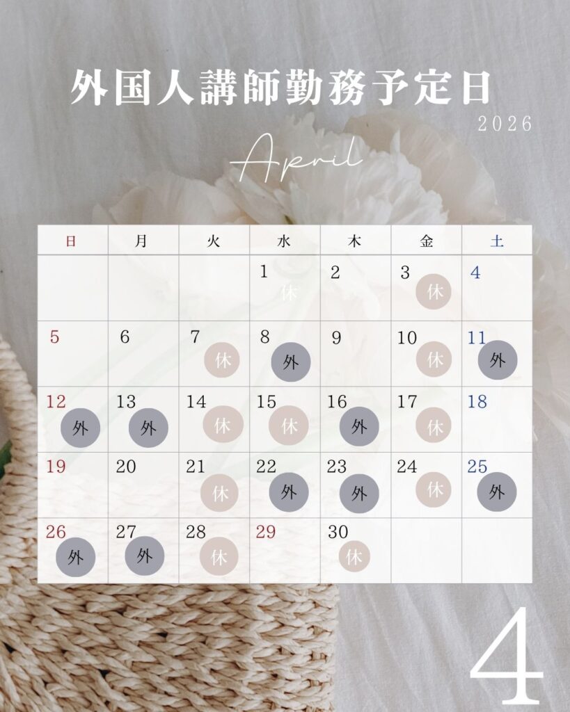 今月の開校日と外国人講師勤務予定日のご案内