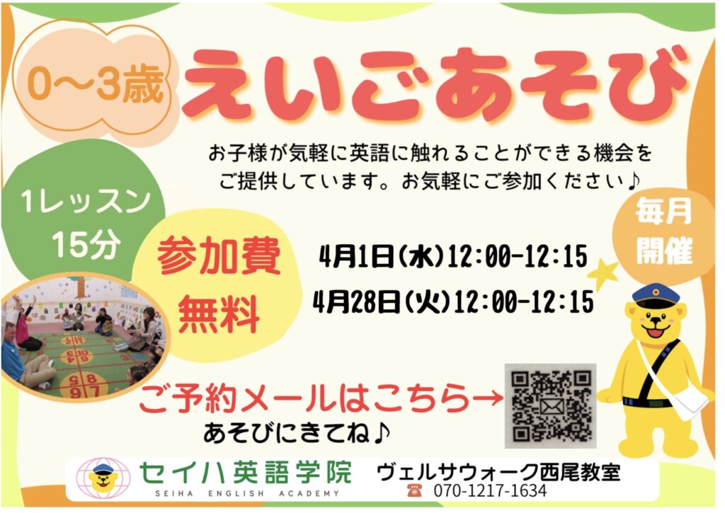 次回英語あそびのご案内です!英語あそびは、教室やショッピングセンターの広場で開催するため、天気や気温を気にせず、室内でご参加いただけます♪ぜひ歌やゲームを織り交ぜながら 、「遊具」に関する単語や数字、アルファベットに触れて楽しみませんか?15分のみなのでお気軽にご参加いただけ、外国人講師ともふれあえます☆お散歩やお買い物ついでに、ぜひお立ち寄りください♪講師一同お待ちしております(^^)