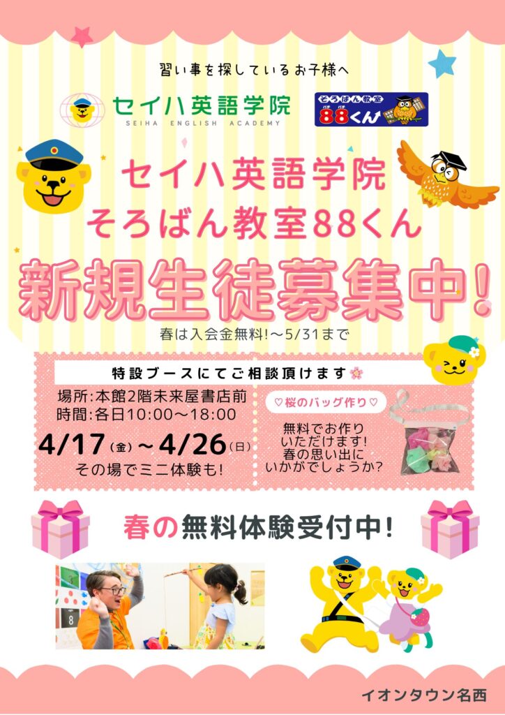 英語・そろばん セイハ2ブランドをご体験いただける大チャンスです!その他、春にちなんだ塗り絵や作りなど、楽しい桜のバッグ作りイベントも併せて実施★