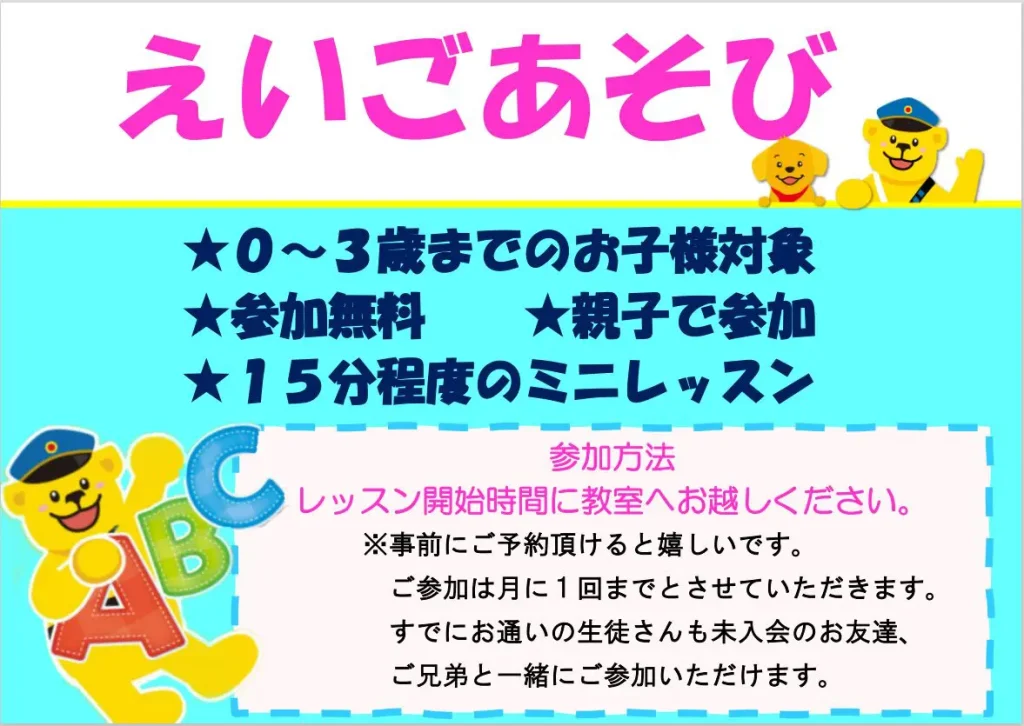 府中教室3月のえいごあそびは 3/5 (木) 12:15~12:30 3/17(火) 12:15~12:30 です。 毎月異なるトピックでイベントを行っております★ 今月のトピックは、Food(たべもの)です🍔🍕 一緒に英語で歌ったり、ゲームをして楽しみましょう♪