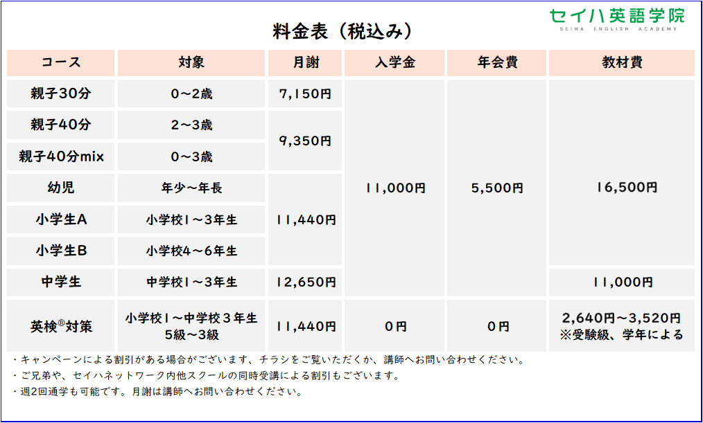 セイハ英語学院イオンモール名取ANNEX教室の料金表はこちらになります!