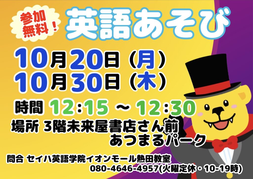 10月20日(月)、10月30日(木)時間: 12:15-12:30上記日程でハロウィンをテーマにした無料ミニイベントありますので遊びに来てください!!