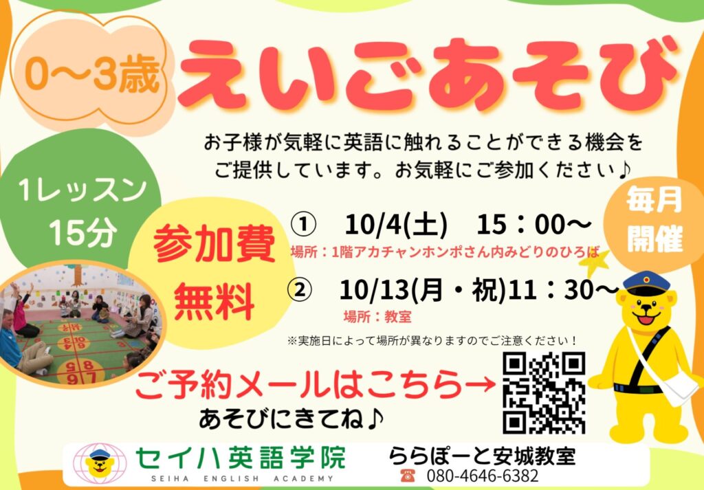 こんにちは♪朝晩はすっかり涼しさを感じるようになり、秋が訪れましたね。過ごしやすい季節をぜひ満喫したいです!英語あそびは、お散歩やお買い物がてら、教室や広場で安全にご参加いただけます♪ぜひ歌やゲームを織り交ぜながら 、ハロウィンに関する単語やアルファベット、数字に触れて楽しみませんか?15分だけなのでお気軽にご参加いただけ、外国人講師ともふれあえます☆ぜひお立ち寄りください♪講師一同お待ちしております🎃