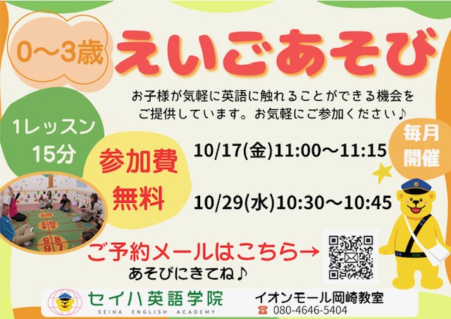 こんにちは♪朝晩はすっかり涼しさを感じるようになり、秋が訪れましたね。過ごしやすい季節をぜひ満喫したいです!英語あそびは、お散歩やお買い物がてら、教室や広場で安全にご参加いただけます♪ぜひ歌やゲームを織り交ぜながら 、ハロウィンに関する単語やアルファベット、数字に触れて楽しみませんか?15分だけなのでお気軽にご参加いただけ、外国人講師ともふれあえます☆ぜひお立ち寄りください♪講師一同お待ちしております(^^)