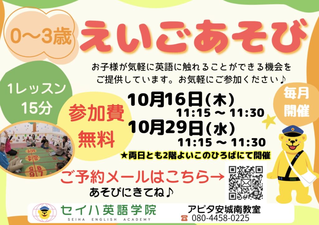 こんにちは♪朝晩はすっかり涼しさを感じるようになり、秋が訪れましたね。過ごしやすい季節をぜひ満喫したいです!英語あそびは、お散歩やお買い物がてら、教室や広場で安全にご参加いただけます♪ぜひ歌やゲームを織り交ぜながら 、ハロウィンに関する単語やアルファベット、数字に触れて楽しみませんか?15分だけなのでお気軽にご参加いただけ、外国人講師ともふれあえます☆ぜひお立ち寄りください♪講師一同お待ちしております(^^)